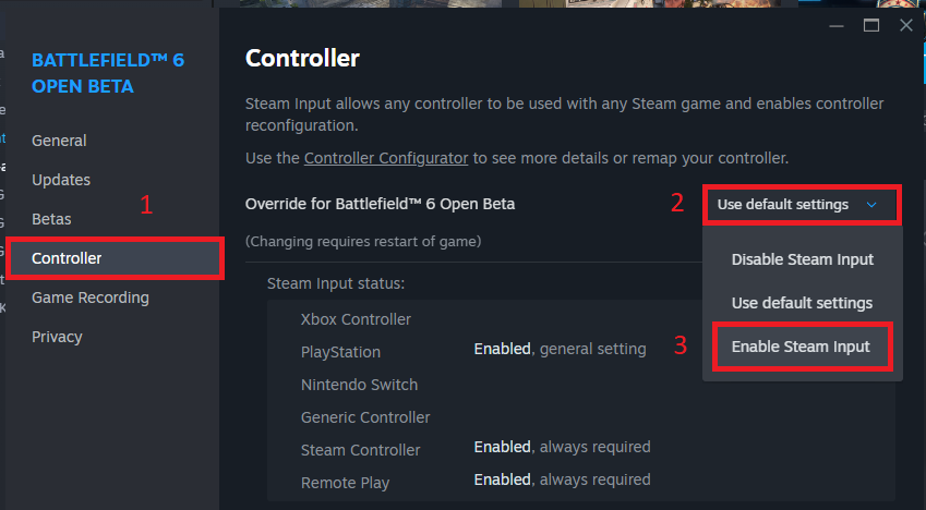 بدلاً من الاعتماد على برامج خارجية، قم بتهيئة وحدة التحكم الخاصة بك مباشرةً عبر Steam. يُعد Steam Input موثوقًا به من قبل معظم الألعاب ويتجنب التعارض مع نظام مكافحة الغش في Battlefield 6.