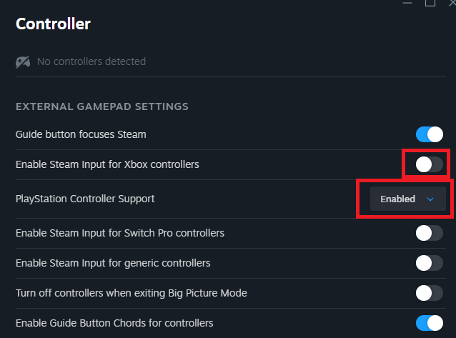 3. قم بتمكين دعم وحدة تحكم PlayStation أو تمكين Steam Input لوحدات تحكم Xbox حسب جهازك.