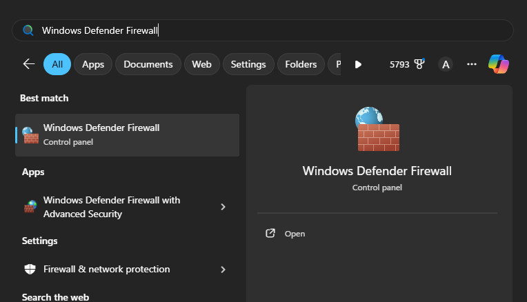 - ابحث عن Windows Defender Firewall في قائمة ابدأ وافتحه.
