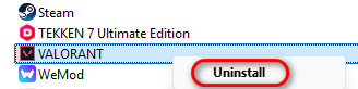- حدد موقع Valorant، انقر بزر الماوس الأيمن عليها، واختر إلغاء التثبيت.