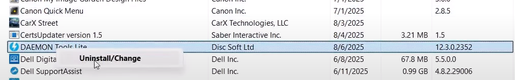 - في نافذة البرامج والميزات، حدد موقع Daemon Tools، وانقر بزر الماوس الأيمن عليه، وحدد إلغاء التثبيت/تغيير.