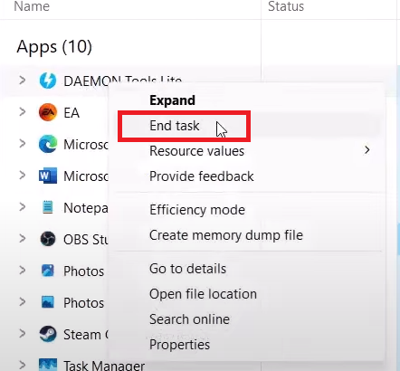 1. إغلاق Daemon Tools من مدير المهام