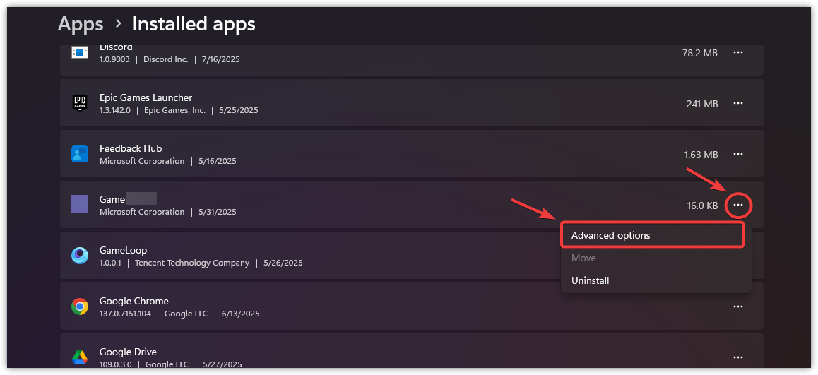 - انقر على النقاط الثلاث بجانبها واختر خيارات متقدمة.