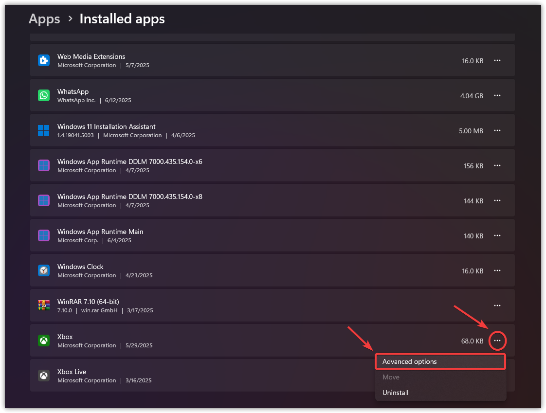 - انقر على النقاط الثلاث بجوار تطبيق Xbox واختر الخيارات المتقدمة.