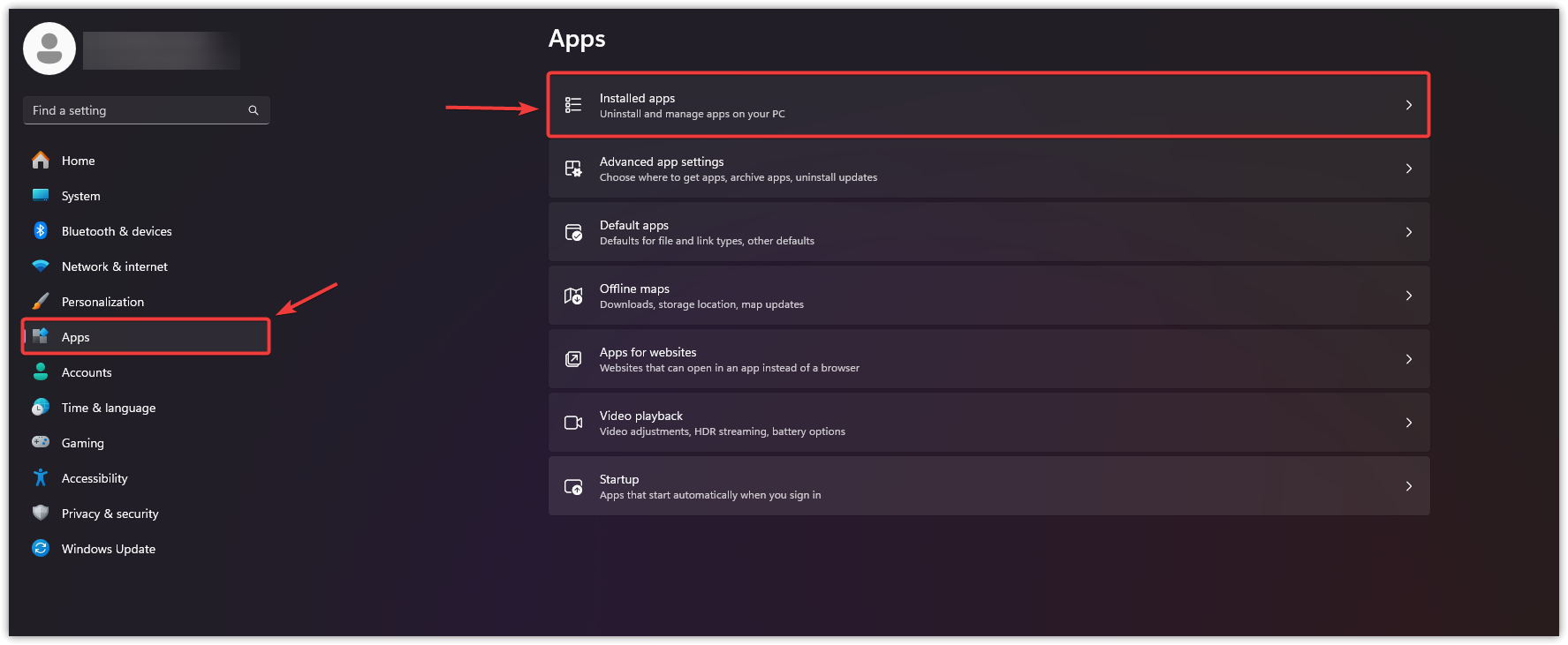 - حدد التطبيقات من الشريط الجانبي الأيسر، ثم اختر التطبيقات المثبتة.