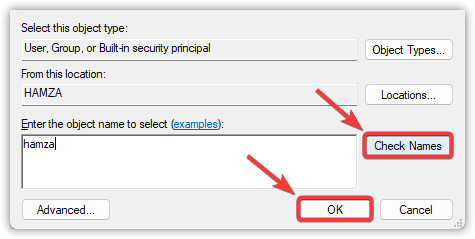 - أدخل اسم مستخدم Windows الخاص بك، انقر على التحقق من الأسماء، ثم اختر موافق.