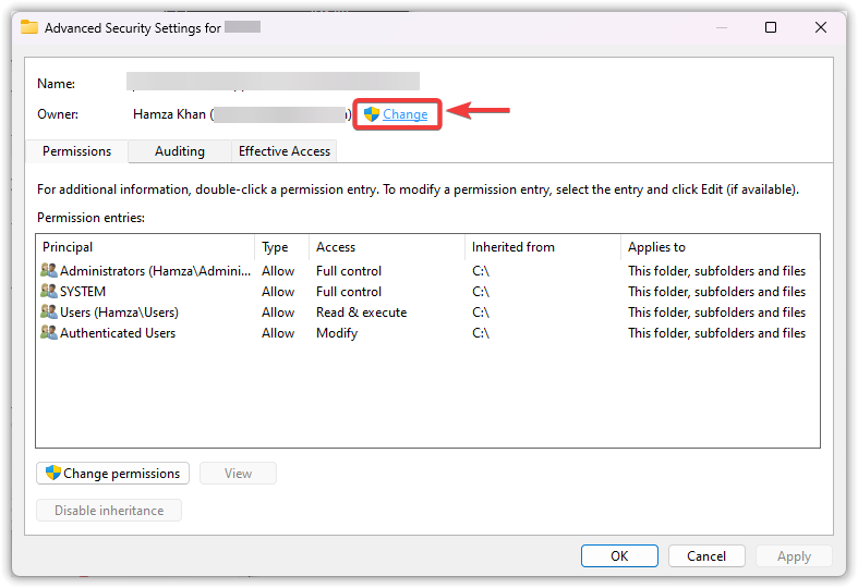 - انقر على تغيير بجوار حقل المالك.