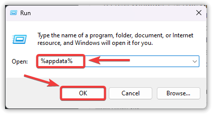 - أعد فتح مربع حوار التشغيل (Windows + R)، ثم اكتب %appdata%، وانقر على موافق.