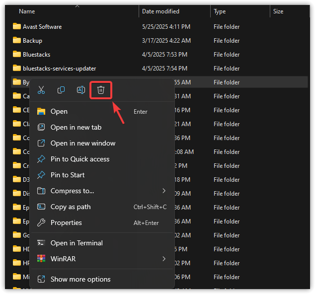 - انقر بزر الفأرة الأيمن على المجلد واختر حذف.