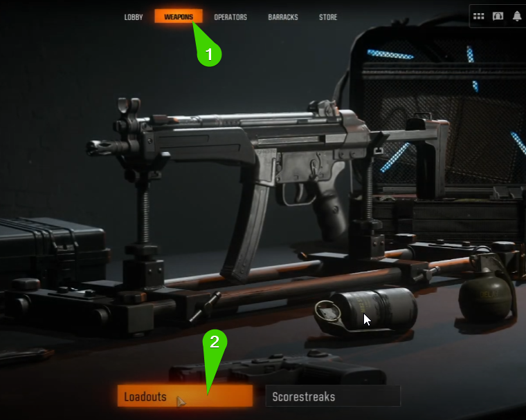 - حدد علامة التبويب الأسلحة، ثم انتقل إلى التجهيزات.