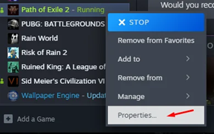 - في مكتبتك، انقر بزر الماوس الأيمن على Path of Exile 2 وحدد Properties.