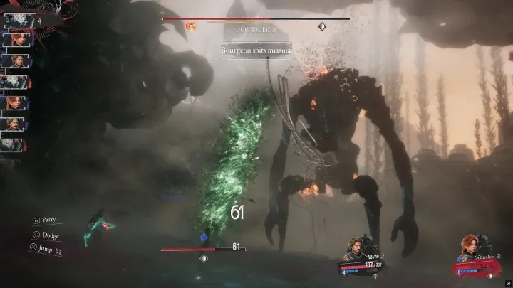 تجنب هذا بتفادي ميازما. بمجرد أن يُبصق الـ Burgeon ميازما الخضراء، انتظر ثانية كاملة قبل التفادي. هذه بصقة بطيئة الحركة، عليك تفاديها قبل أن تهبط عليك مباشرةً. في دورة واحدة، يُمكنه أن يُبصق أربع كرات من ميازما. حركته الأخرى هي مجموعة ضربات من أربع ضربات. أولاً، سيُنفّذ ضربة جسدية أبطأ عليك. ثم سيلفّ ذراعه ليضربك ثلاث مرات بقبضته بتتابع سريع.