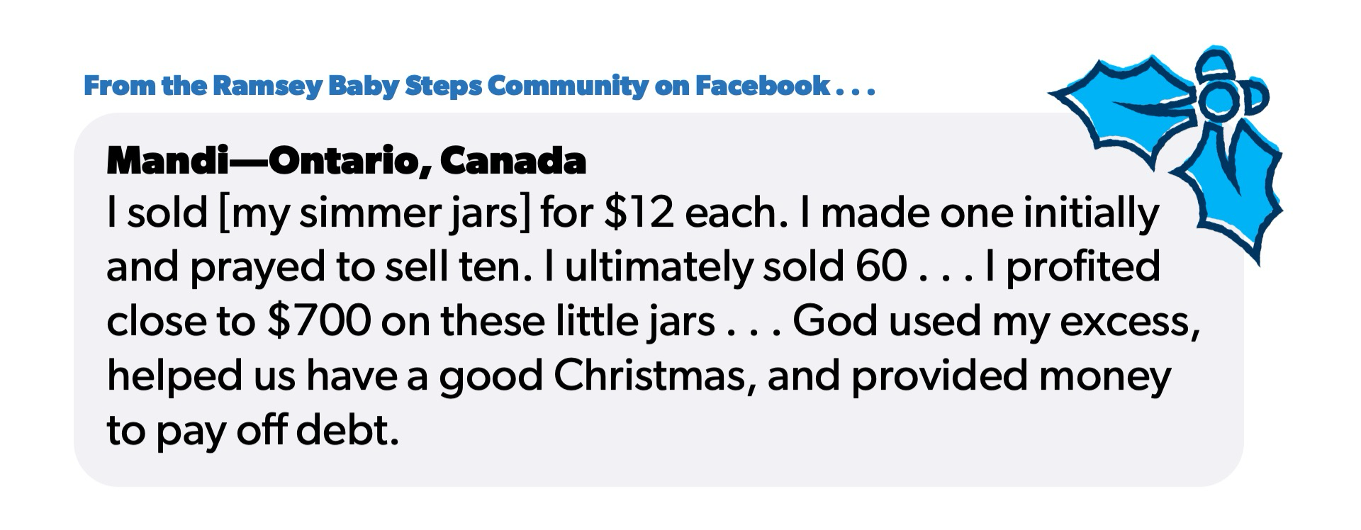 “لقد أضفت أعواد القرفة، واليانسون النجمي، وحبوب الفلفل الأسود، والقرنفل الكامل، وقصاصات الصنوبر من شجيرة في فناء منزلي، وبعض التوابل لتعزيز الرائحة حقًا”، قالت مندي. “كل العناصر كانت متوفرة لدي… صنعت علامة بشعار وتعليمات قمت بطباعتها من المنزل. اشتريت بعض خيوط الجوت وبعض الأكياس لتعبئة الطلبات بالإضافة إلى ملصقات “صنع بحب” من متجر الدولار… صنعت زخرفة من صودا الخبز ونشا الذرة والماء. في النهاية، نفدت زخرفاتي واستخدمت بعض زينة عيد الميلاد التي كانت لدي… بعت الجرار مقابل 12 دولارًا لكل منها. صنعت واحدة في البداية ودعوت أن أبيع 10. في النهاية بعت 60… ربحت ما يقرب من 700 دولار على هذه الجرار الصغيرة… استخدم الله فائضي، وساعدنا على قضاء عيد ميلاد جيد، ووفر المال لسداد الديون.”