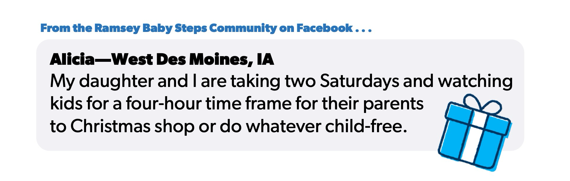 أليشيا في مجتمع Ramsey Baby Steps على Facebook هي مقدمة رعاية نهارية بدوام كامل، لكنها أتاحت خدماتها للآباء في عطلات نهاية الأسبوع خلال العطلات. قالت: “أنا وابنتي سنأخذ يومين سبت ونعتني بالأطفال لمدة أربع ساعات ليتمكن آباؤهم من التسوق لعيد الميلاد أو فعل أي شيء بدون أطفال”.