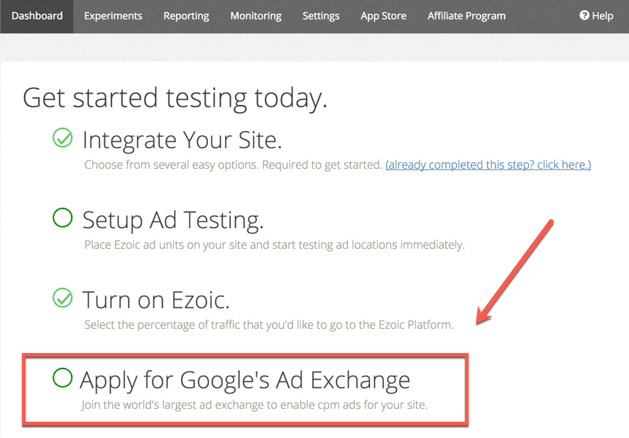 الآن، ارجع إلى لوحة معلومات Ezoic وسترى النص التالي أسفل “تقديم طلب للحصول على Google Ad Exchange“:
