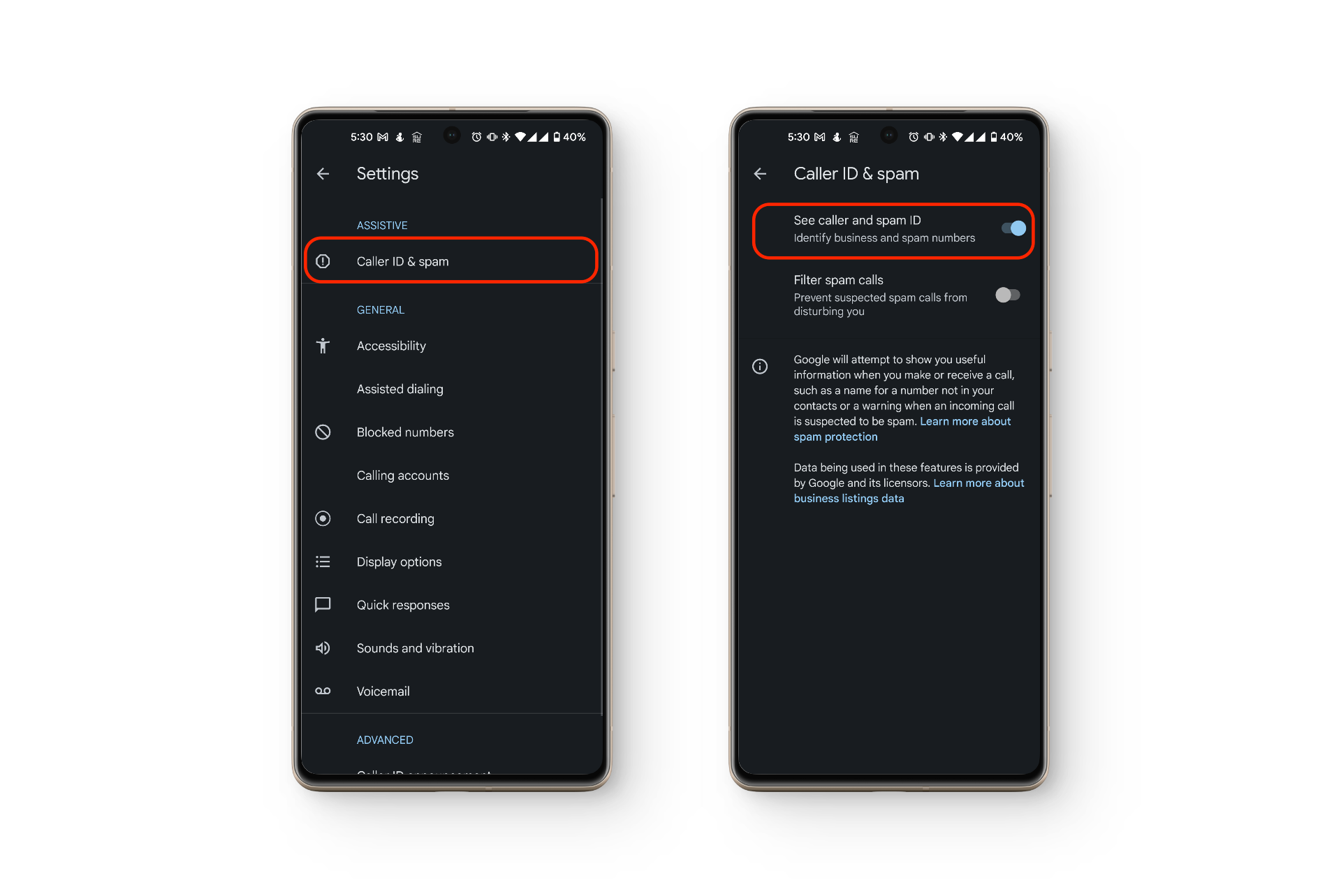 يتضمن تطبيق Google Phone ميزة تسمى “معرف المتصل والبريد العشوائي“، والتي يمكنها حظر إشعارات المكالمات من الأرقام التي يعتقد أنها بريد عشوائي أو غير معروفة. في بعض الأحيان، قد تحظر مكالمات مشروعة عن طريق الخطأ.