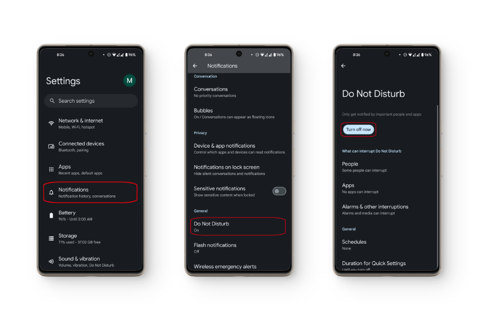 خطوتك التالية يجب أن تكون التحقق مما إذا كان إعداد ما يمنع هاتفك عمدًا من عرض إشعارات المكالمات الواردة. على وجه التحديد، تحقق مما إذا كان وضع عدم الإزعاج (DND) أو وضع الطائرة قيد التشغيل. يُسكت وضع عدم الإزعاج جميع التنبيهات، بما في ذلك المكالمات والرسائل النصية. يُعطل وضع الطائرة جميع الإشارات اللاسلكية والخلويّة.