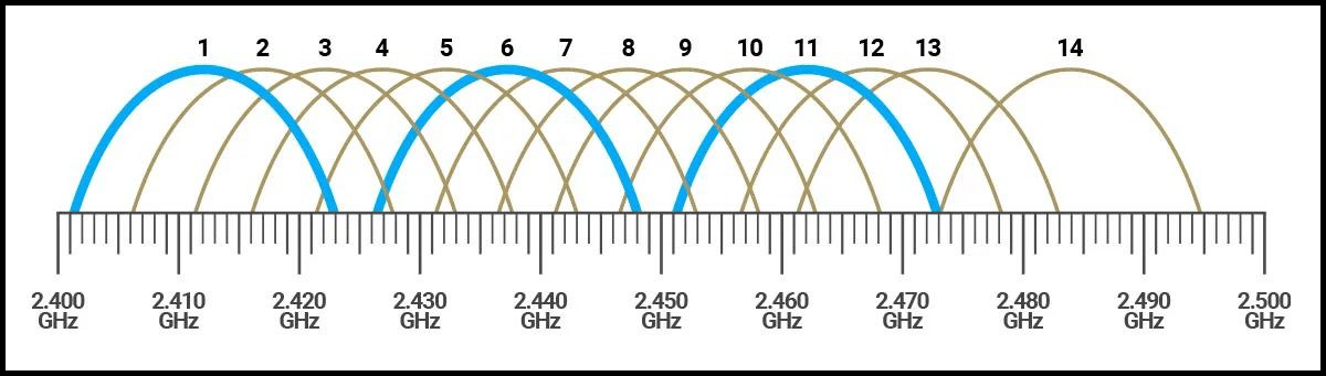 ينقسم نطاق تردد Wi-Fi إلى قنوات، وهي الوسيط الذي نرسل أو نستقبل البيانات من خلاله. يحتوي نطاق التردد 2.4 جيجاهرتز على 11 قناة، بينما يحتوي نطاق 5 جيجاهرتز على 45 قناة مختلفة. ومع ذلك، من بين الـ 11 قناة، 3 فقط (1 و 6 و 11) يمكنها العمل دون تداخل مع بعضها البعض. غالبًا ما تتداخل القنوات المتبقية وتعيق عملية إرسال واستقبال البيانات.