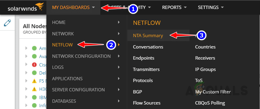 2. انتقل إلى لوحات المعلومات الخاصة بي (My Dashboards) ثم انقر على ملخص NTA (NTA Summary) من القائمة الفرعية NetFlow.