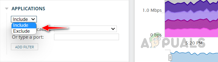 1. انقر على القائمة المنسدلة واختر تضمين لعرض حركة مرور الشبكة من التطبيق المحدد فقط، أو اختر استبعاد لتجنب إظهار بيانات حركة المرور من ذلك التطبيق المحدد.