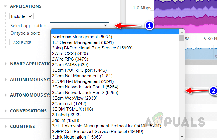 أحد الخيارات المتاحة عند إنشاء عرض مخصص في SolarWinds NTA هو القدرة على حصر العرض لإظهار حركة مرور الشبكة من وإلى تطبيقات معينة فقط، أو استبعاد حركة المرور منها وإليها. تتيح لك هذه الميزة اكتساب فهم أعمق لكيفية تأثير التطبيقات المختلفة على حركة مرور الشبكة لديك. يمكنك استخدام هذا الخيار لتحليل بيانات حركة المرور لتطبيق معين أو استبعاد بيانات حركة المرور لتطبيق لا يثير اهتمامك. يمكننا أيضًا استخدام رقم منفذ التطبيق لتصفية حركة المرور.