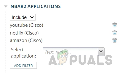 لدينا خيارات لتضمين أو استبعاد تطبيقات NBAR2 في العرض المخصص. حدد التطبيقات وانقر على إضافة عامل تصفية.
