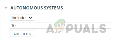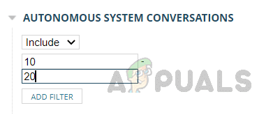 باستخدام هذا الخيار، يمكننا تضمين أو استبعاد حركة المرور من أنظمة مستقلة معينة. أدخل معرف النظام المستقل وانقر على إضافة عامل تصفية.