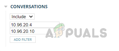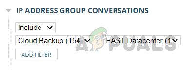 يمكن استخدام هذا الخيار لتصفية المحادثات بين مجموعات عناوين IP معينة. حدد مجموعة عناوين IP المصدر والوجهة التي تريد تضمينها أو استبعادها من القائمة المكونة مسبقًا وانقر على إضافة عامل تصفية.