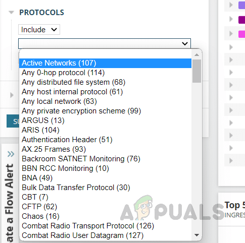 باستخدام هذا الخيار، يمكننا تضمين أو استبعاد تفاصيل حركة المرور لبروتوكولات معينة. اختر البروتوكول المفضل من القائمة وانقر على إضافة عامل تصفية.
