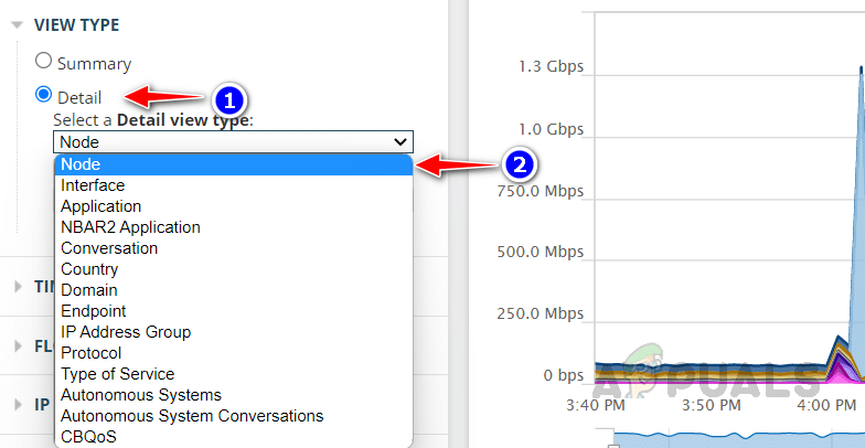2. لاختيار جهاز أو واجهة محددة، حدد تفاصيل (Details) في نوع العرض (View Type) ثم حدد عقدة (Node) أو واجهة (Interface) من القائمة المنسدلة.