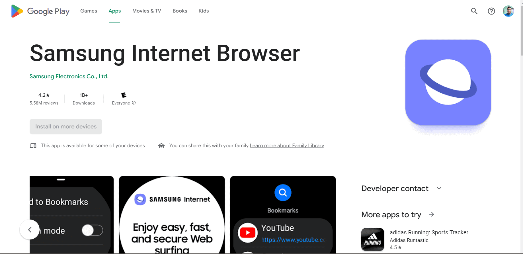 بينما يوحي الاسم بـ Samsung، فإن متصفح Samsung Internet متوافق مع جميع أجهزة Android. يتوفر متصفح الويب المجاني هذا للتنزيل على Google Play Store وقد تم تنزيله بواسطة أكثر من مليار مستخدم قاموا بتقييمه بـ 4.1.