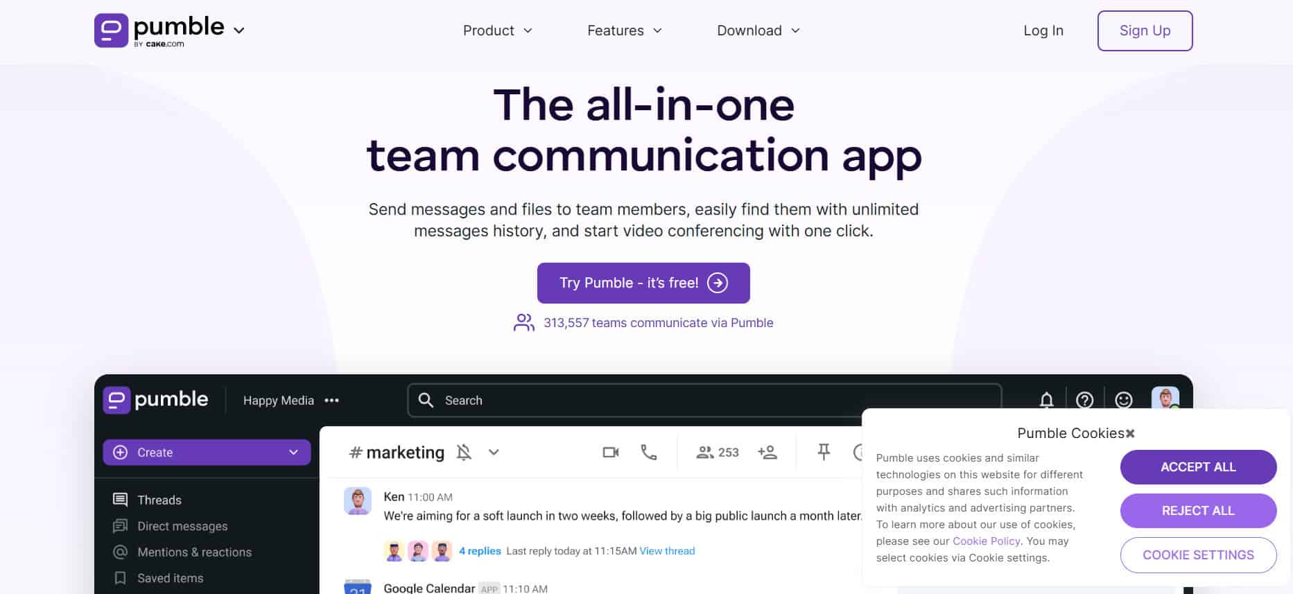 ما يميز Pumble هو عدد المستخدمين والرسائل والسجل غير المحدود، حتى في خطته المجانية، مقارنة بالمنافسين. يجمع أفضل ميزات البريد الإلكتروني و MS Teams و Slack ليمنح الفرق مجموعة أدوات قوية تبدو مألوفة ومريحة. تحصل على رسائل مباشرة، وقنوات، ومحادثات متسلسلة، ومشاركة الملفات، ومكالمات صوتية ومرئية. تفتح الخطط المدفوعة إمكانية مشاركة الشاشة وأدوات الإدارة لإكمال التجربة للفرق النامية.