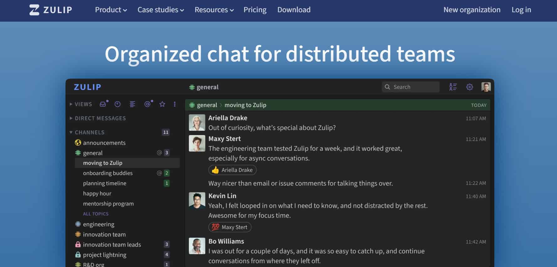 يقدم Zulip لمسة أنيقة للمحادثات الجماعية من خلال مزج الرسائل الفورية مع هيكل سلاسل المحادثات على غرار البريد الإلكتروني. هذا يسهل تتبع كل محادثة! يمكن للفرق مناقشة الأمور، والمزاح باستخدام الرموز التعبيرية، وحتى مشاركة الأكواد أو المعادلات الرياضية، كل ذلك دون أن يفوتهم أي شيء. كل هذه الإيجابيات تجعله أحد أفضل بدائل Slack مفتوحة المصدر.