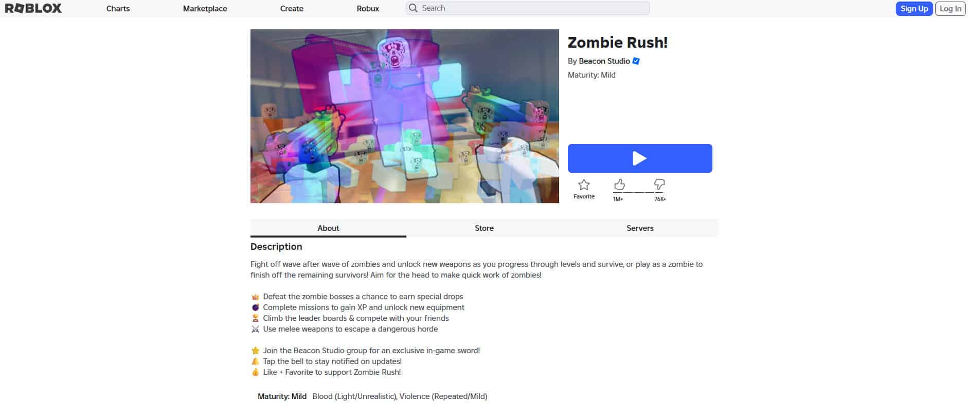 تُعد Zombie Rush واحدة من أكثر ألعاب الزومبي زيارةً على Roblox، وتقدم تجربة بقاء على قيد الحياة في موجات من منظور الشخص الثالث مع لمسة مميزة: يمكنك أيضًا اللعب كزومبي! بفضل الذكاء الاصطناعي الأكثر ذكاءً للأعداء والأسلحة الجديدة مثل Nuke Launcher، تحافظ اللعبة على الإثارة والمتعة. العب كناجٍ أو اقلب السيناريو واطارد أصدقائك.