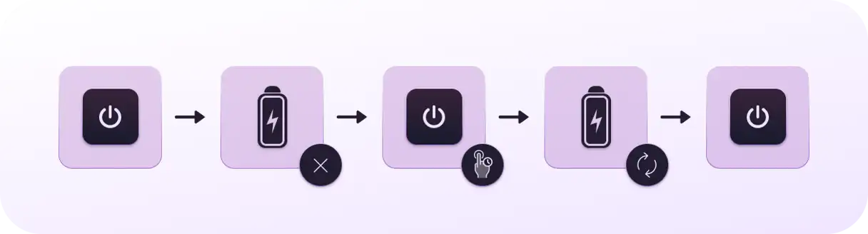 - بعد إزالة البطارية، اضغط باستمرار على زر الطاقة لمدة 5 ثوانٍ. هذه الخطوة ضرورية لتفريغ أي شحنة كهربائية متبقية في النظام.