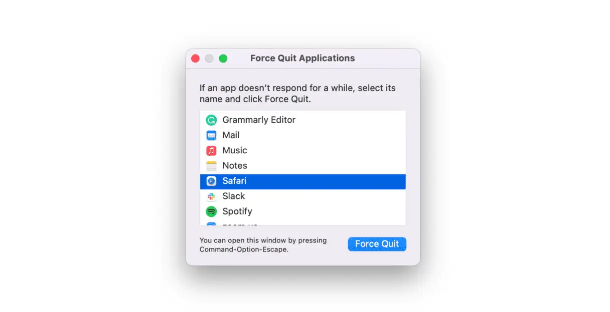 - في النافذة التي ستظهر، سترى قائمة بجميع التطبيقات النشطة على جهاز Mac الخاص بك. حدد التطبيق الذي تريد إغلاقه وانقر على “Force Quit” (إجبار على الإغلاق).