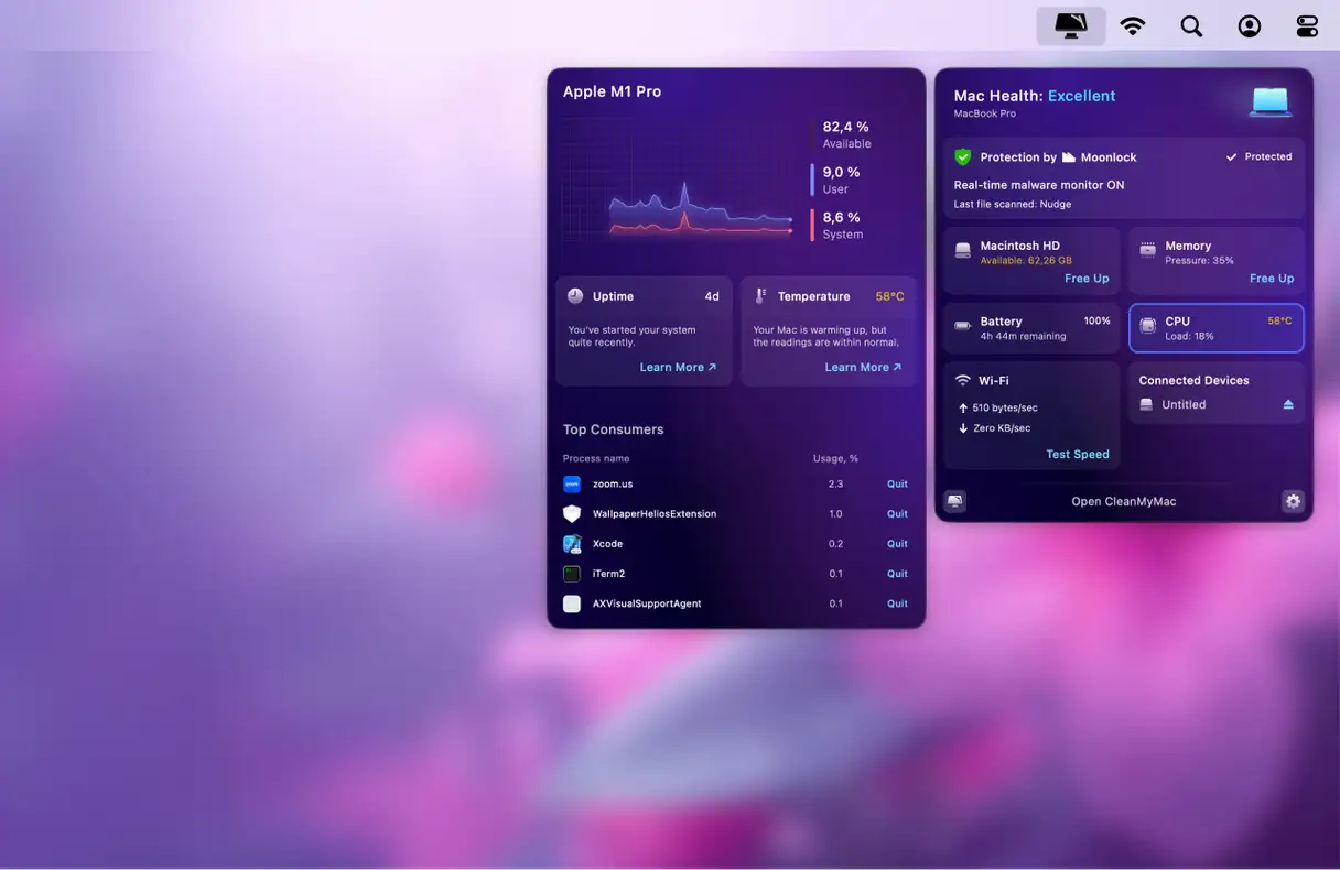 للتحكم في درجة حرارة المعالج الخاص بك، استخدم تطبيق القائمة (Menu App) المرفق مع CleanMyMac. إنها أداة رائعة للمساعدة في تقليل الضغط على جهاز Mac الخاص بك ومراقبة حالته في مكان واحد. يمكنك من خلاله مراقبة استهلاك الذاكرة العشوائية (RAM) أيضًا.