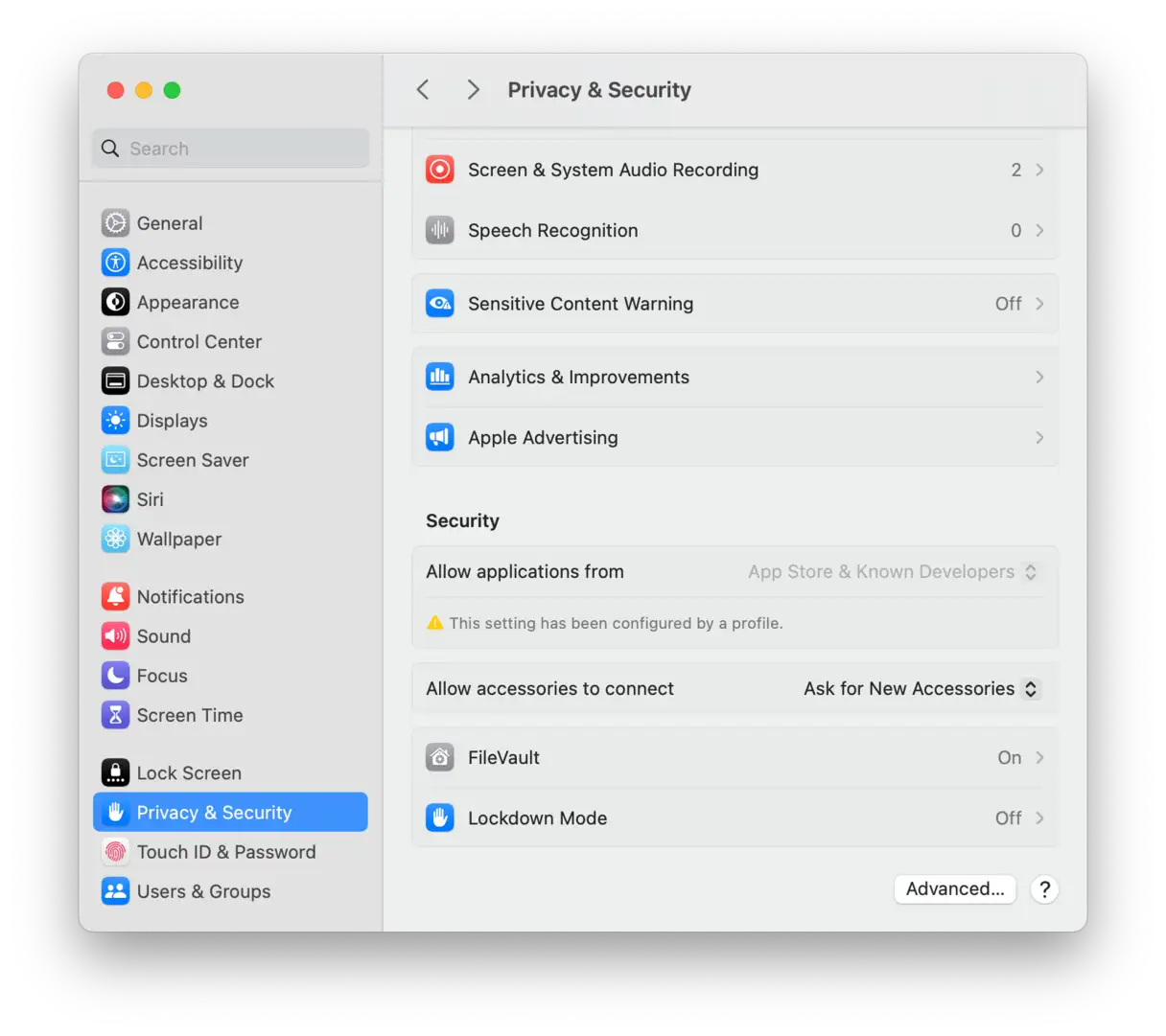 - انتقل إلى “System Settings” (إعدادات النظام) ثم “Privacy & Security” (الخصوصية والأمن).