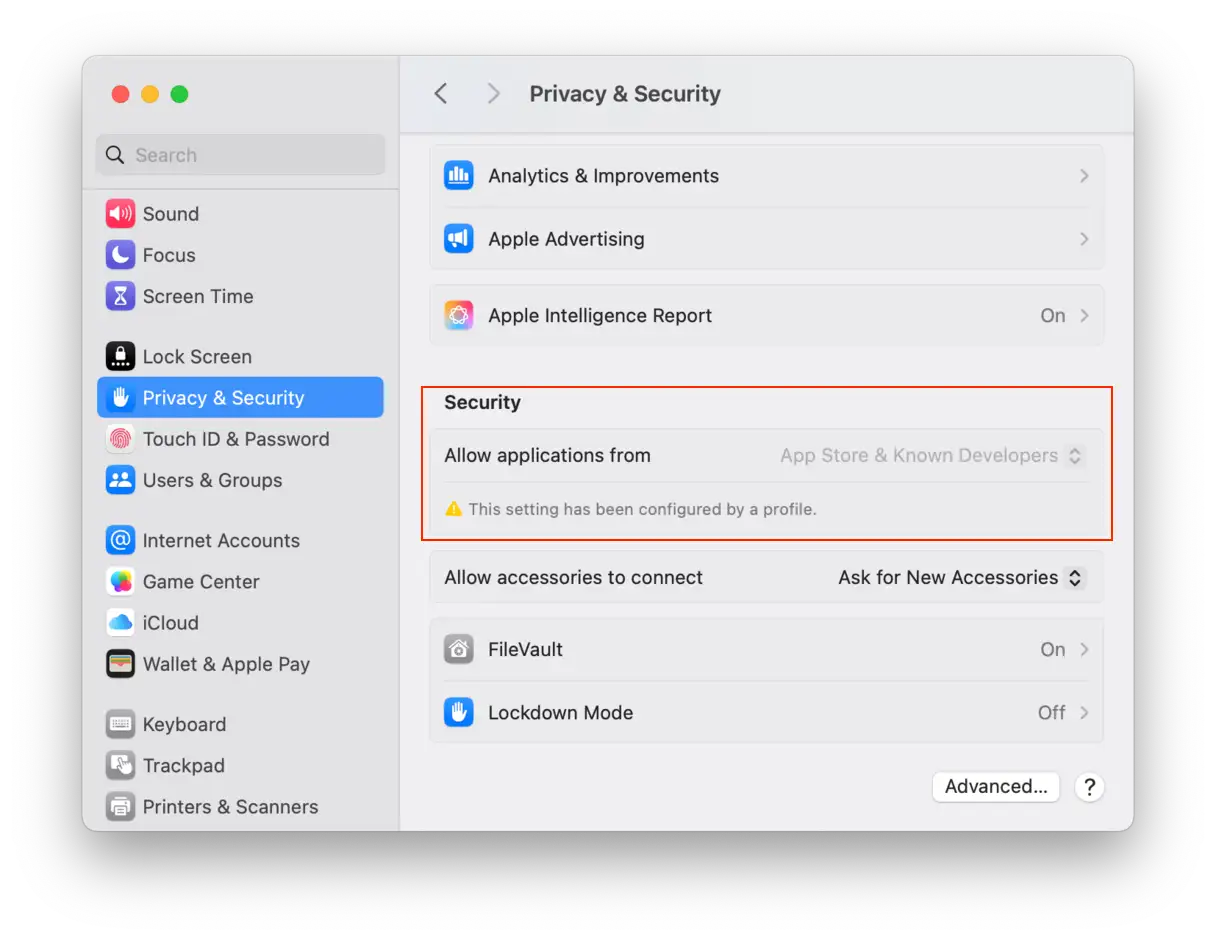 - ضمن قسم “Security” (الأمن)، تأكد من تحديد خيار “App Store and identified developers” (متجر التطبيقات والمطورين المعروفين) أو “App Store” (متجر التطبيقات) فقط. هذا يضمن أن نظام التشغيل سيسمح فقط بتثبيت التطبيقات التي تم فحصها واعتمادها من قبل Apple، مما يوفر طبقة إضافية من الحماية ضد البرامج الضارة.