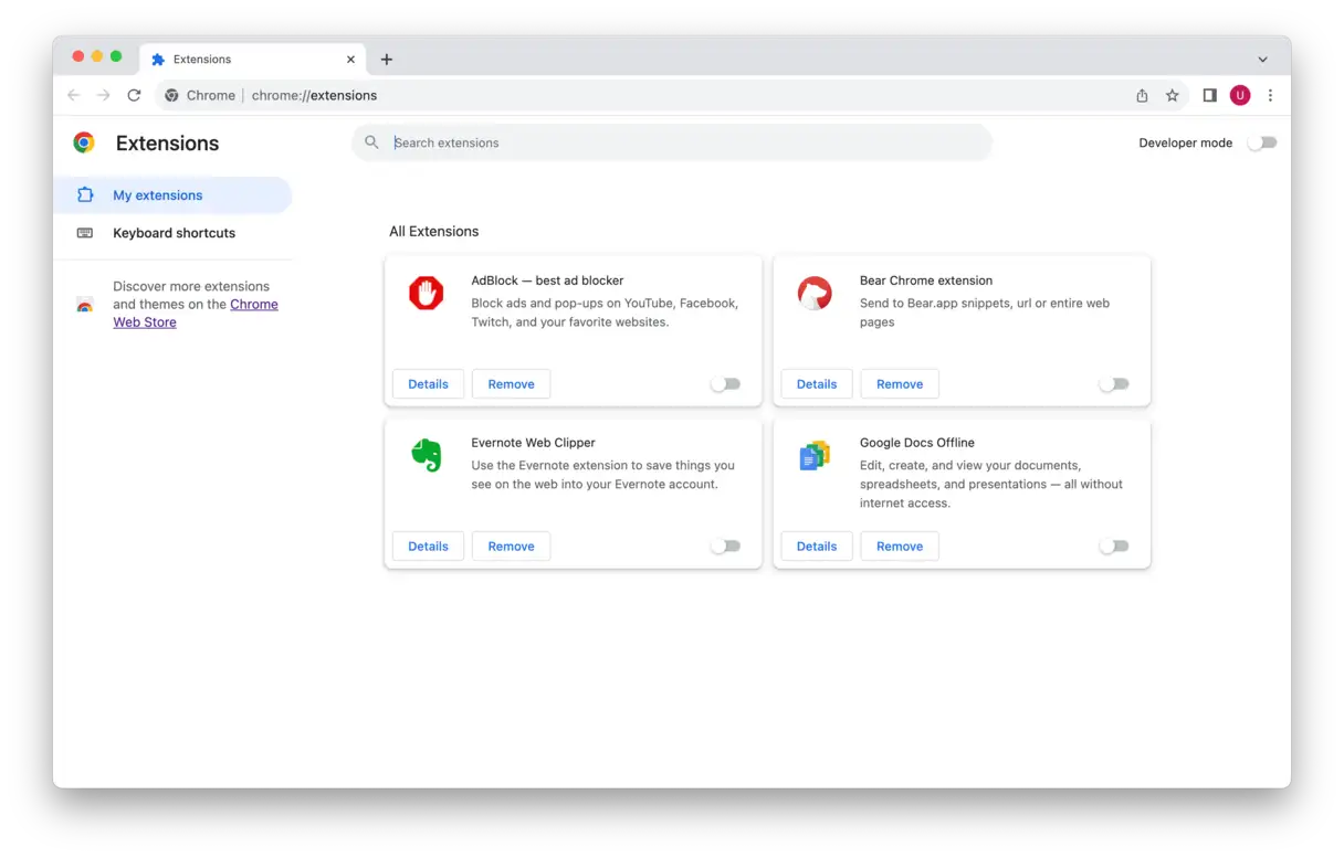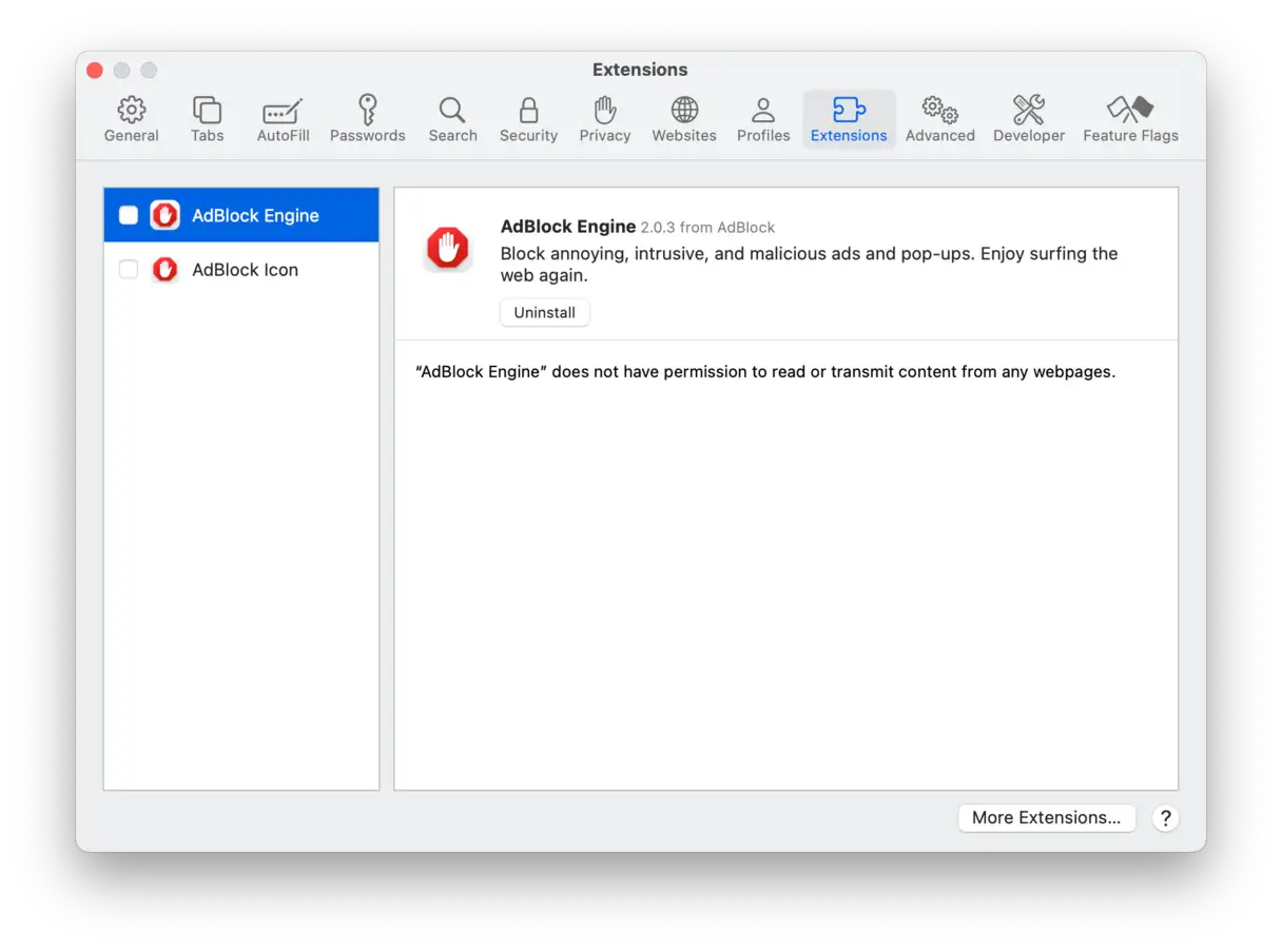 تتسلل بعض الفيروسات والبرامج الضارة إلى جهاز Mac الخاص بك في صورة ملحقات للمتصفح. لذلك، تُعدّ مراجعة هذه الإضافات والمكونات الإضافية طريقة أخرى للكشف عن البرامج الضارة المحتملة. تجدر الإشارة إلى أنك ستحتاج إلى فحص جميع المتصفحات المثبتة على جهاز الكمبيوتر الخاص بك. فيما يلي خطوات فحص الملحقات في ثلاثة من أشهر المتصفحات، مع التركيز على كيفية تحديد الملحقات المشبوهة وإزالتها لضمان حماية جهازك من البرامج الضارة المحتملة: