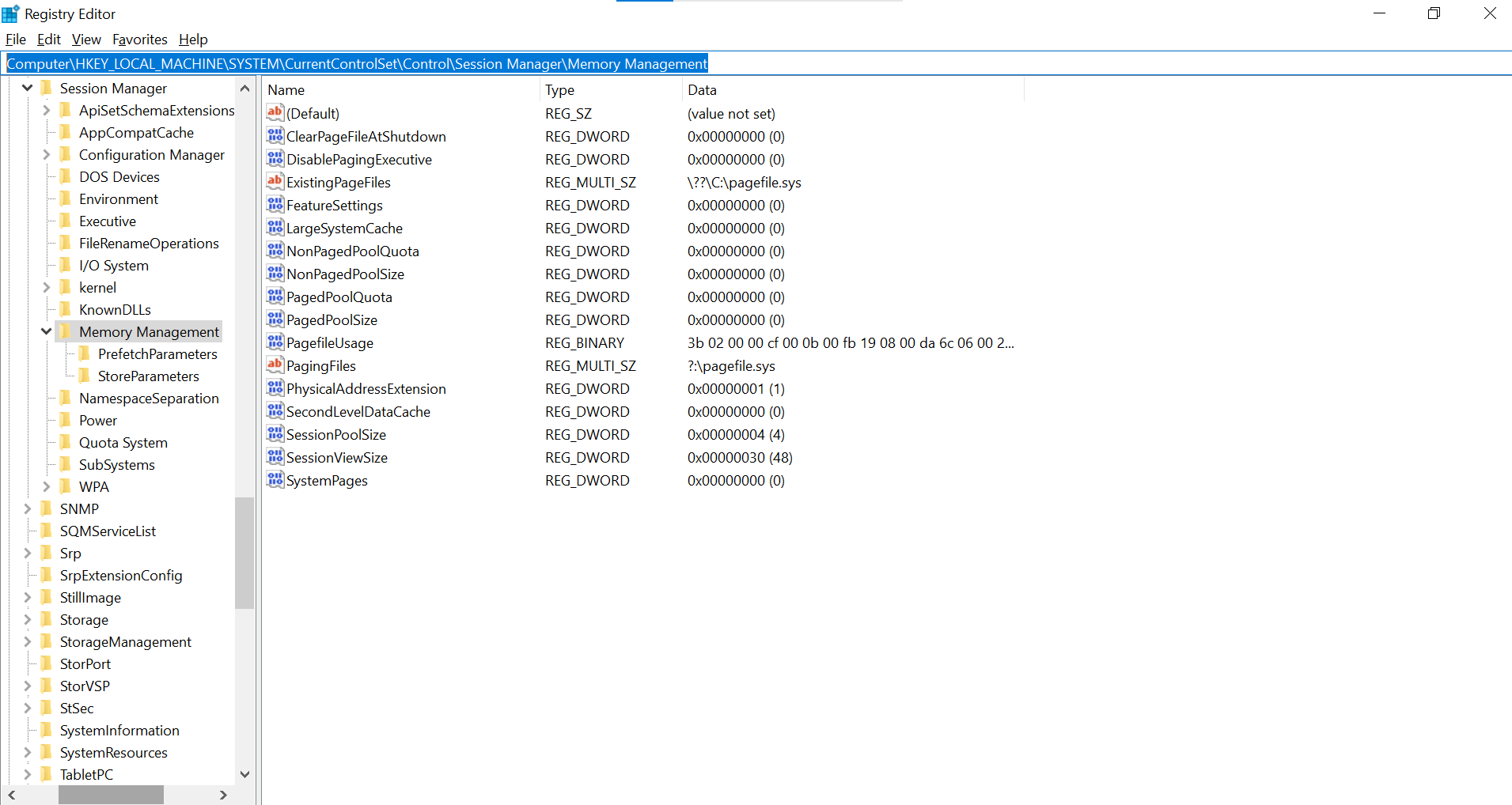 - في شريط البحث، اكتب ما يلي: “ComputerHKEY_LOCAL_MACHINESYSTEMCurrentControlSetControlSession ManagerMemory Management“