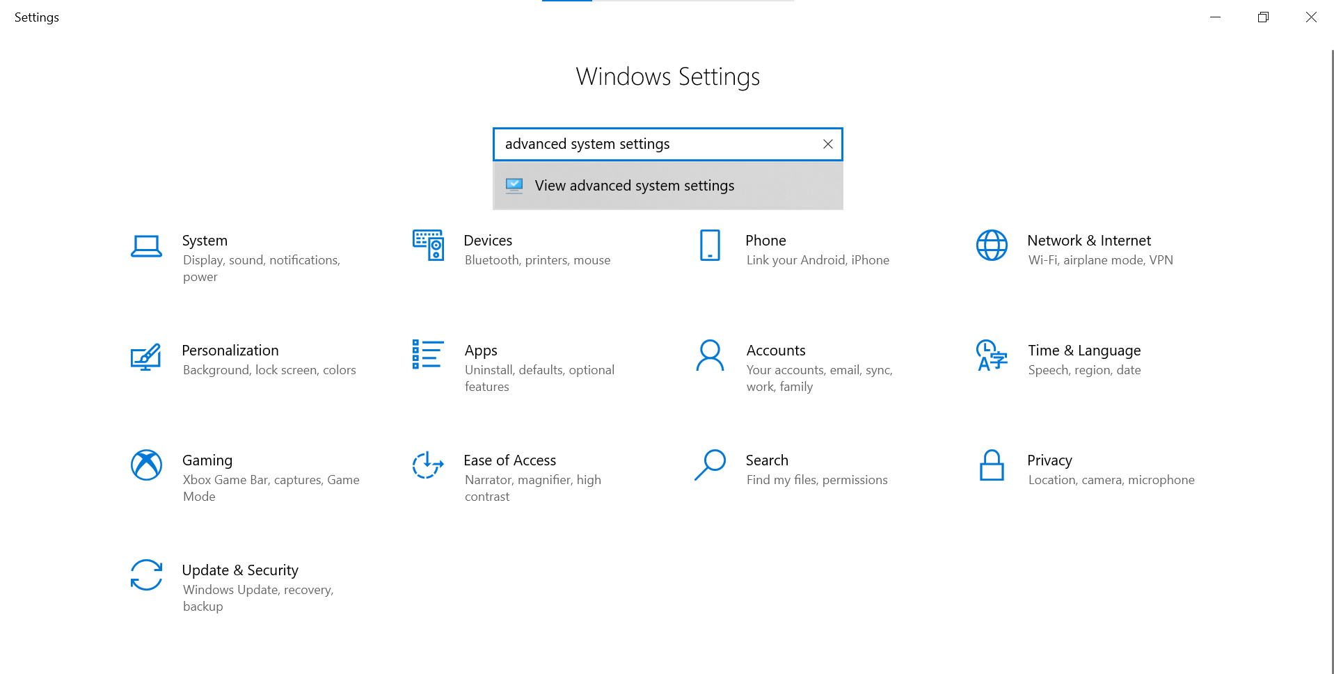 إذا كنت تتلقى تحذيرات بأن نظامك قد نفدت منه الذاكرة الافتراضية، فإن زيادتها يجب أن يساعد. انتقل إلى القائمة > الإعدادات. للوصول إلى خيارات التكوين الإضافية، اكتب “إعدادات النظام المتقدمة” في شريط البحث.