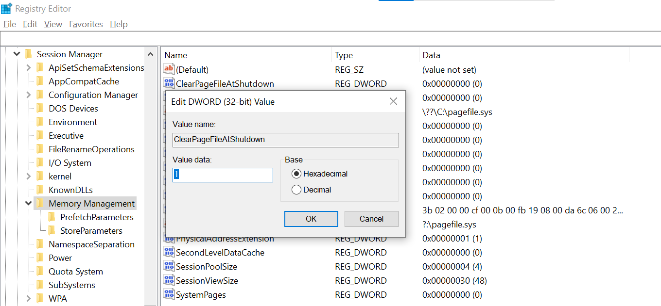 - ضع علامة في المربع المسمى “ClearPageFileAtShutdown“. اكتب “1” في مربع “Value Data“، ثم اختر “OK“.