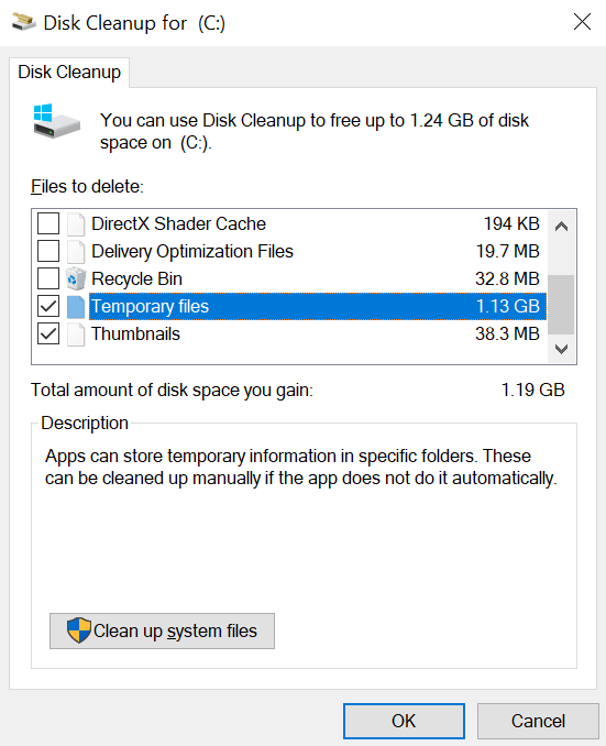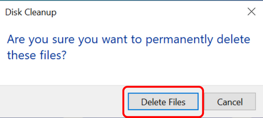 ما عليك سوى تحديد الملفات المؤقتة (Temporary files) والنقر على “OK“. عندما يُطلب منك التأكيد، انقر على “Delete Files“.