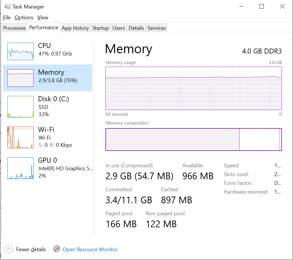 ضع في اعتبارك أن التطبيقات التي تتطلب موارد أكثر تحتاج إلى ذاكرة وصول عشوائي (RAM) أكبر، لذا فإن الاستخدام العالي لذاكرة RAM قد لا يشير بالضرورة إلى وجود مشكلة. يمكن أن يوضح الرسم البياني استخدامك لذاكرة RAM بمرور الوقت. انتقل إلى علامة التبويب “Performance” وانقر على “Memory”.