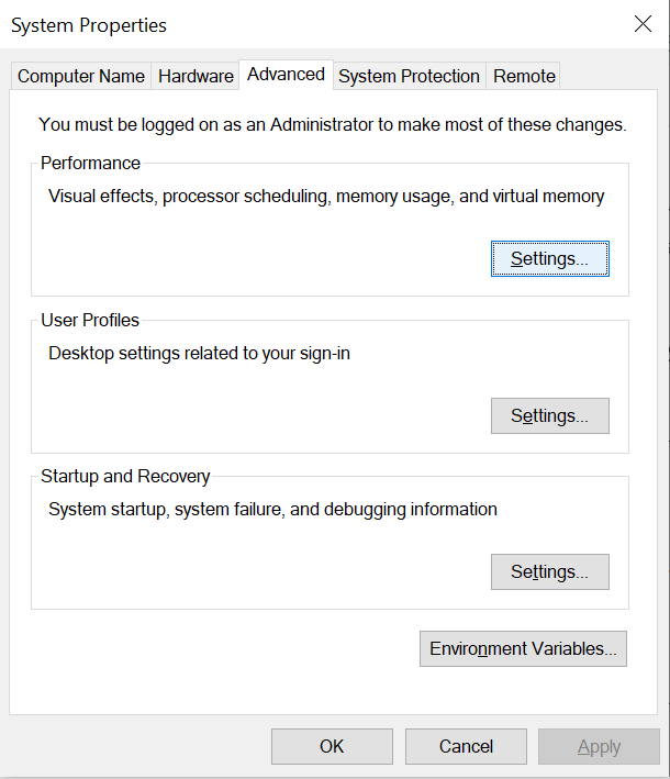 بالنسبة لـ Windows 10، بعد الوصول إلى “إعدادات النظام المتقدمة“، سترى قسم “الأداء“. هنا، انقر فوق خيار “الإعدادات“.