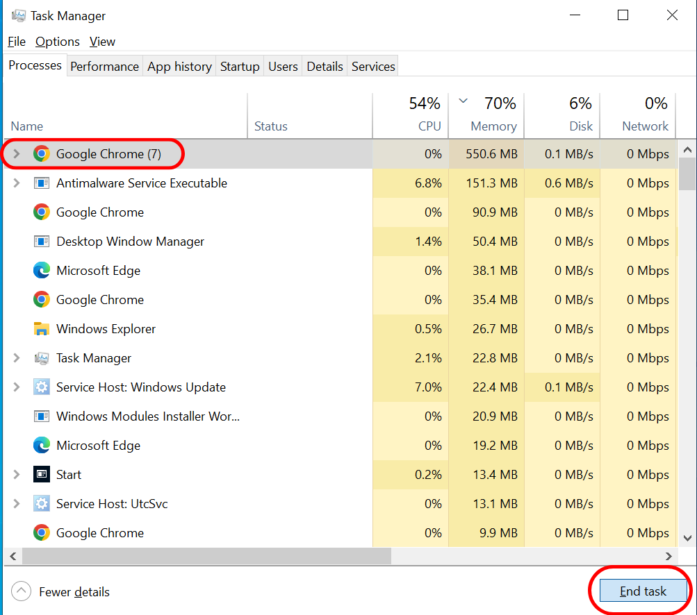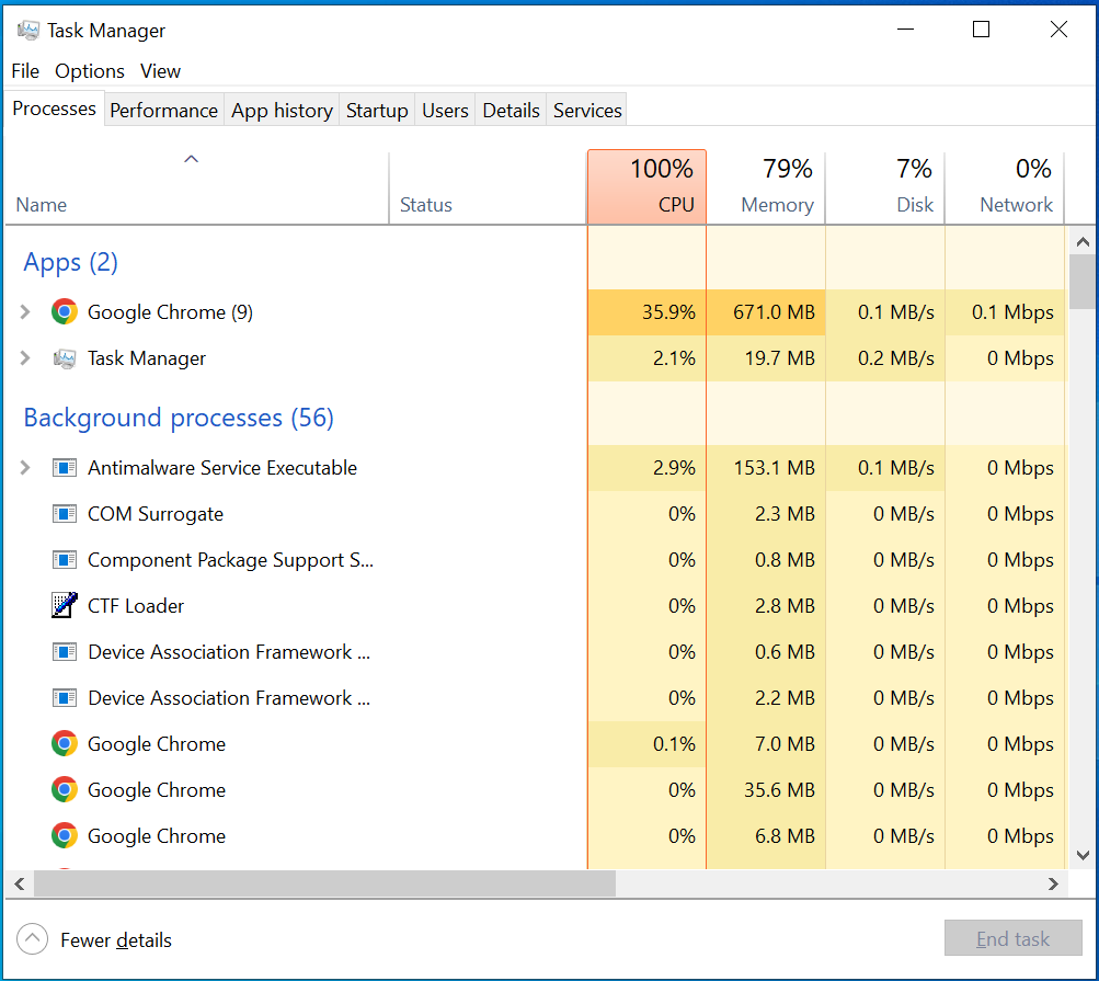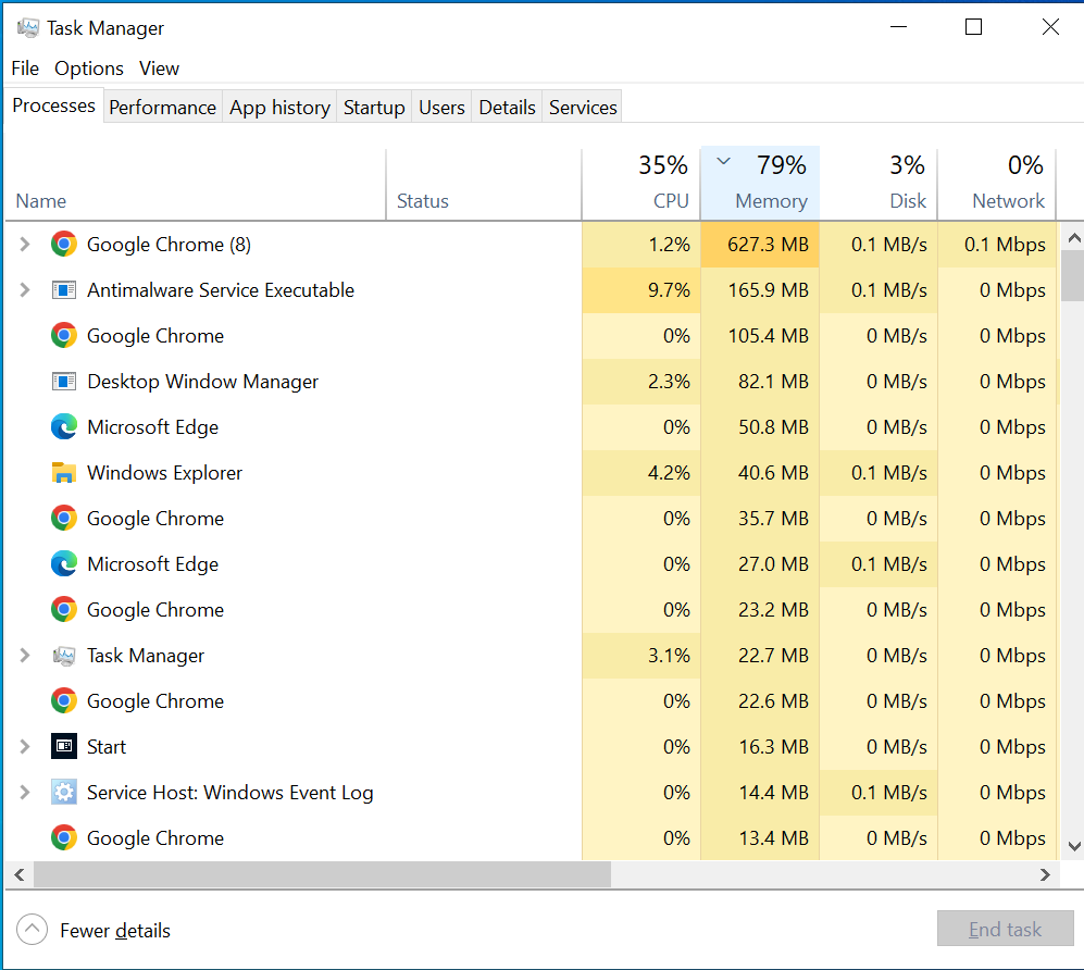 إذا كانت ذاكرة الوصول العشوائي (RAM) بجهاز الكمبيوتر الخاص بك تستمر في الامتلاء، فقد يكون ذلك علامة على وجود برامج ضارة. ستستخدم البرامج الضارة المصممة لسرقة البيانات حتمًا قدرًا كبيرًا من ذاكرتك. Windows Defender بحد ذاته كافٍ لاكتشاف أي فيروسات في نظامك، ولكن هناك أيضًا أدوات طرف ثالث يمكن أن تساعدك في تحقيق نفس النتيجة. تحقق من وجود أي عمليات تبدو غير عادية في “إدارة المهام” (Task Manager) أولاً لمعرفة ما إذا كان بإمكانك اكتشاف الجاني يدويًا لقتله. ولكن حتى إذا عثرت عليه، فلا يزال يوصى بإجراء فحص لمكافحة الفيروسات على جهاز الكمبيوتر الخاص بك للتأكد من أن كل شيء على ما يرام.