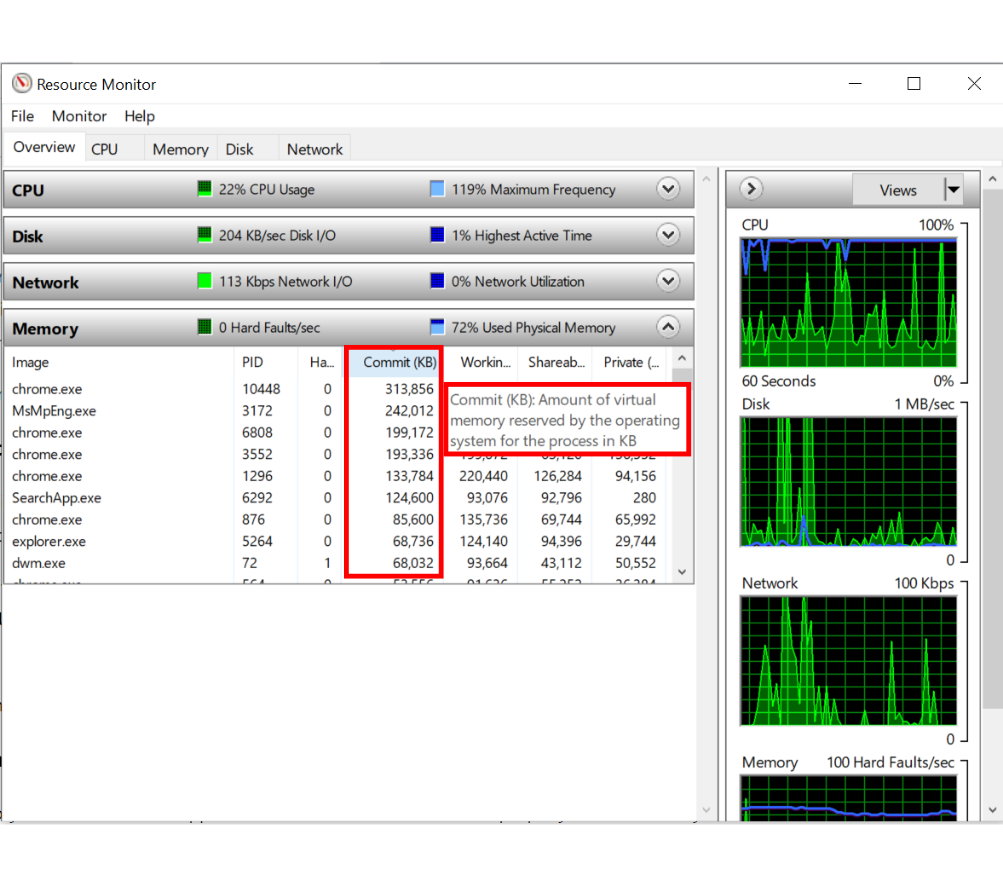 لمعرفة المزيد حول إعدادات الذاكرة لهذه الأداة، انقر على “Open Resource Monitor” في الأسفل. يمكن رؤية مقدار ذاكرة RAM المتاحة في الرسم البياني المصاحب. لتحديد التطبيقات التي تستخدم أكبر قدر من الذاكرة بسرعة، قم بفرز القائمة العلوية حسب “Commit (KB)”. سترى خيارًا لإنهاء هذه التطبيقات.