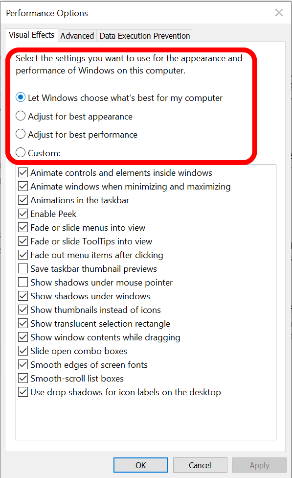 بعد ذلك، سترى “خيارات الأداء“. أفضل خيار هنا هو تعيينه على “دع Windows يختار الأفضل لجهاز الكمبيوتر الخاص بي“. سيسمح هذا لـ Windows بتحسين الذاكرة والاستخدام بنفسه. ومع ذلك، يمكنك أيضًا تعيينه على “ضبط للحصول على أفضل أداء” إذا كنت تشعر أن الضبط التلقائي بواسطة Windows غير فعال. يعد خيار “مخصص” فكرة جيدة أيضًا؛ ومع ذلك، لا يُنصح به للمبتدئين، لأنه قد يسبب أعطالًا في نظامك.