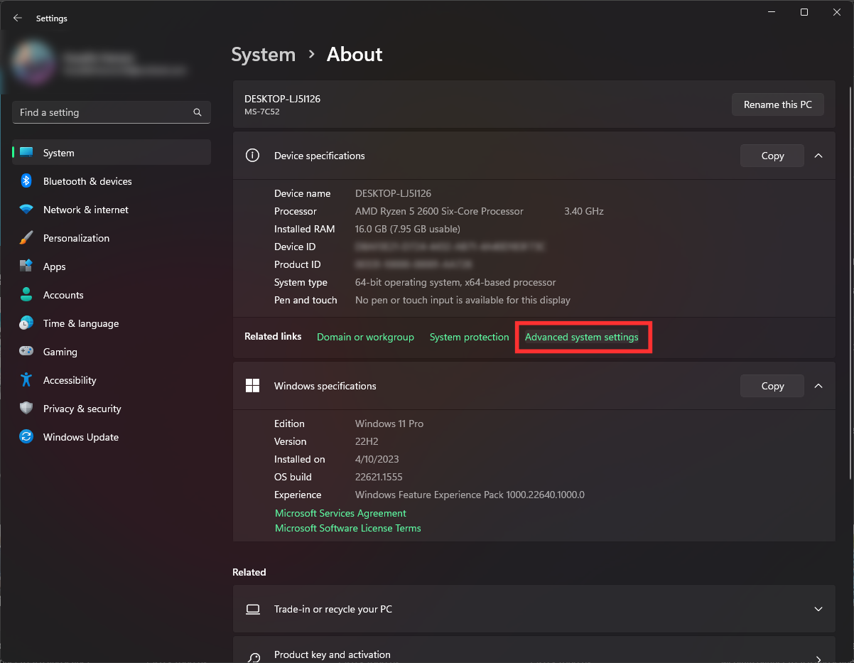 في Windows 11، ابحث عن “مواصفات الجهاز” وابحث عن الإعداد في صف الروابط ذات الصلة. ما عليك سوى النقر عليه وستصل إلى النافذة المطلوبة مباشرةً.